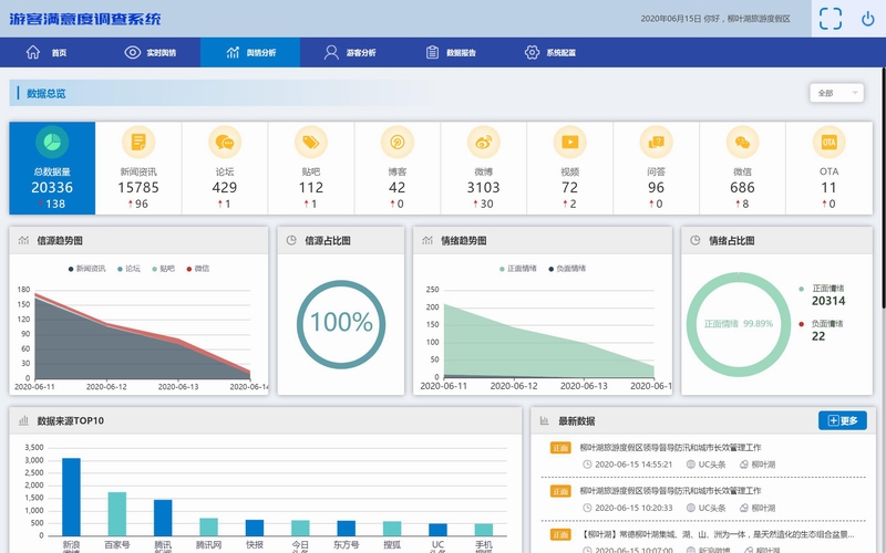 采集主流互聯網渠道上關于旅游景區、住宿、餐飲等方面的評價數據。得出游客對景區、酒店、餐飲等主要旅游要素的正面、負面、中性評價。識別各景區、酒店、餐飲網絡形象變化、市場優勢和短板所在。