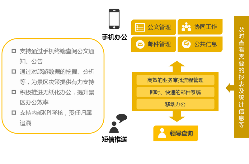 建設景區辦公自動化(OA)系統,發揮辦公自動化系統在景區建設管理中的協同作用,豐富服務、互動和事務處理功能,全面提高景區便捷管理及工作效率,推進網上審批系統建設,支持手機終端查閱公文通知、公告,支持流程管理、電子郵件、文檔管理、公文流轉、審批管理、工作日歷、人員動態展示、財務結算管理、公告、新聞、通知、個人信息維護、會議管理、考勤管理等功能,提升景區辦公效率。