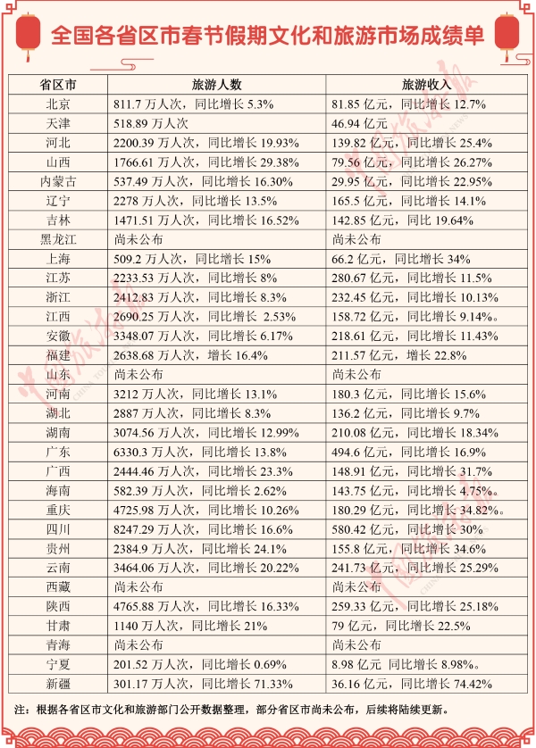 連日來,全國各省區(qū)市文化和旅游部門陸續(xù)發(fā)布了2019年春節(jié)假期文化和旅游市場主要數(shù)據(jù),小編收集整理了相關數(shù)據(jù),讓我們一起來看看這份亮麗的成績單吧!