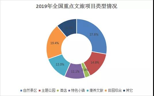 從文旅項目類型分布來看,2019年全國重點文旅項目占比最高的是自然景區(qū),占比約27.8%;其次,田園綜合體和主題公園項目也占據(jù)較大份額,分別為19.4%和14.8%。此外,康養(yǎng)文旅和特色小鎮(zhèn)項目的占比分別為13%和11.1%。