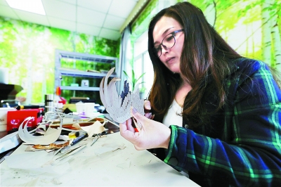 非遺傳承人李艷紅正在工作室內制作樹皮畫。