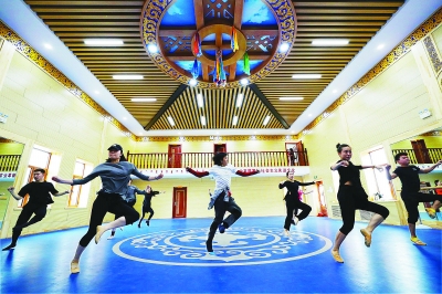 阿爾山市烏蘭牧騎隊員正在排練場排練舞蹈。