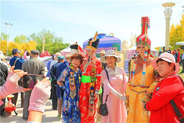 華麗的民族服飾,既能欣賞又能體驗,令在場游客們紛紛對博湖刺繡藝術(shù)之美夸贊不已,一些觀眾還興致勃勃地試穿刺繡蒙古族袍,用相機、手機定格下美好的瞬間。