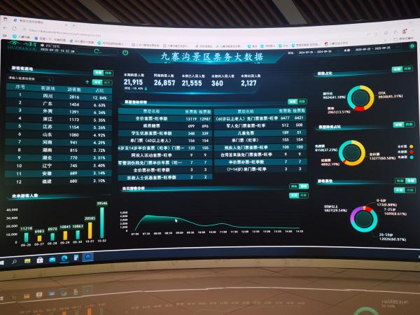 九寨溝智慧管理中心的巨型屏幕上,實時顯示著景點、乘車點、人流密集區域的監控畫面,以及不斷更新的景區票務大數據。景區內布置的600多個智慧監控點實時收集“時空分流”數據,動態調控各景點客流,防止人員過度聚集。