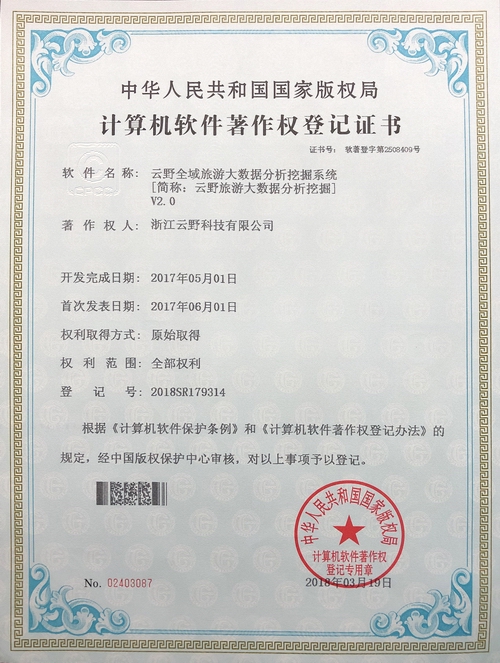 《云野全域旅游大數據分析挖掘系統V2.0》于2018年3月19日被正式授予《中華人民共和國國家版權局計算機軟件著作權登記證書》,登記號為2018SR179314。