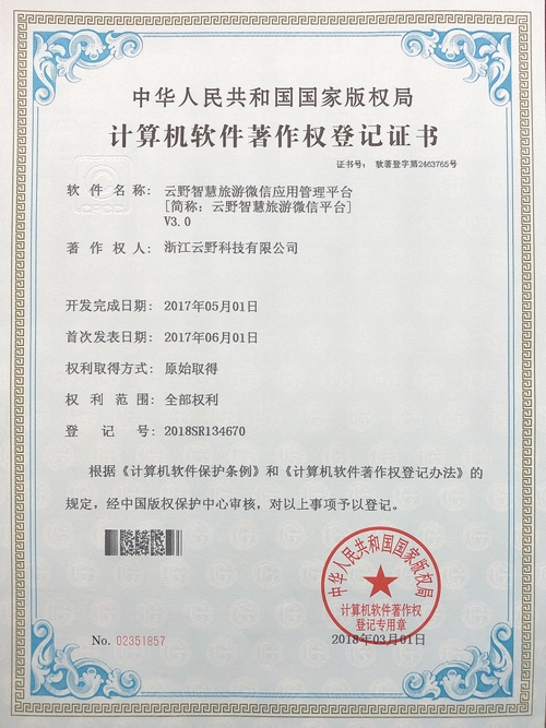 《云野智慧旅游微信應用管理平臺V3.0》于2018年3月1日被正式授予《中華人民共和國國家版權局計算機軟件著作權登記證書》,登記號為2018SR134670。