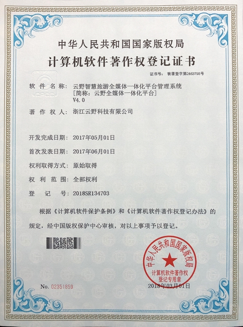 《云野智慧旅游全媒體一體化平臺管理系統V4.0》于2018年3月1日被正式授予《中華人民共和國國家版權局計算機軟件著作權登記證書》,登記號為2018SR134703。