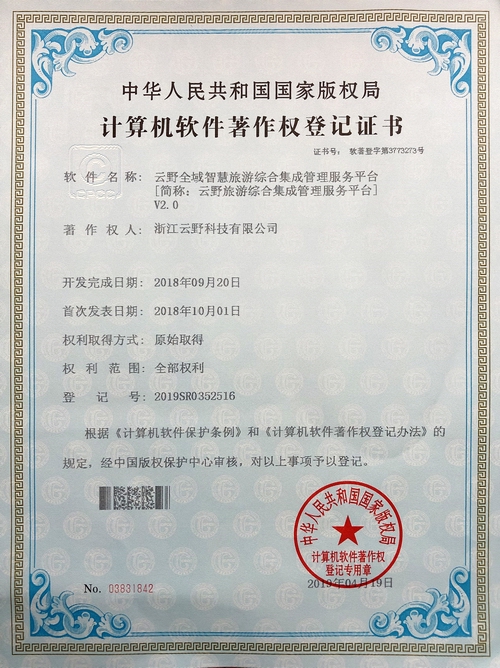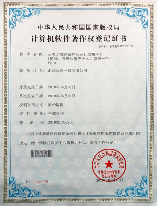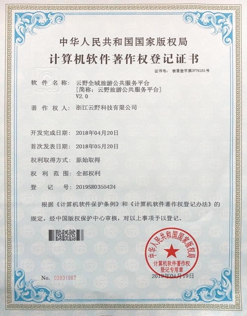《云野全域智慧旅游綜合集成管理服務平臺V2.0》于2019年4月19日被正式授予《中華人民共和國國家版權局計算機軟件著作權登記證書》,登記號為2019SR0352516。