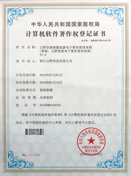 《云野全域智慧旅游電子票務管理系統V2.0》于2019年1月29日被正式授予《中華人民共和國國家版權局計算機軟件著作權登記證書》,登記號為2019SR0103534。