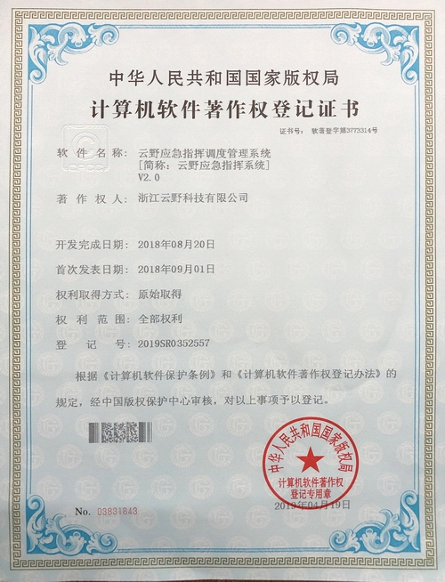 《云野應急指揮調度管理系統V2.0》于2019年4月19日被正式授予《中華人民共和國國家版權局計算機軟件著作權登記證書》,登記號為2019SR0352557。