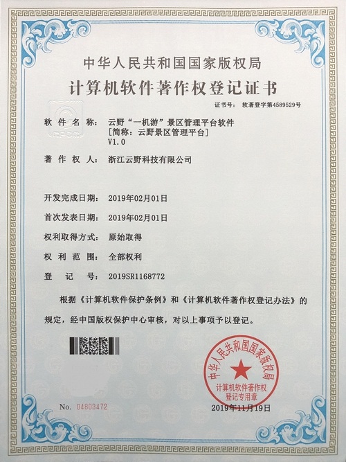 《云野“一機游”景區管理平臺軟件V1.0》于2019年11月19日被正式授予《中華人民共和國國家版權局計算機軟件著作權登記證書》,登記號為2019SR1168772。