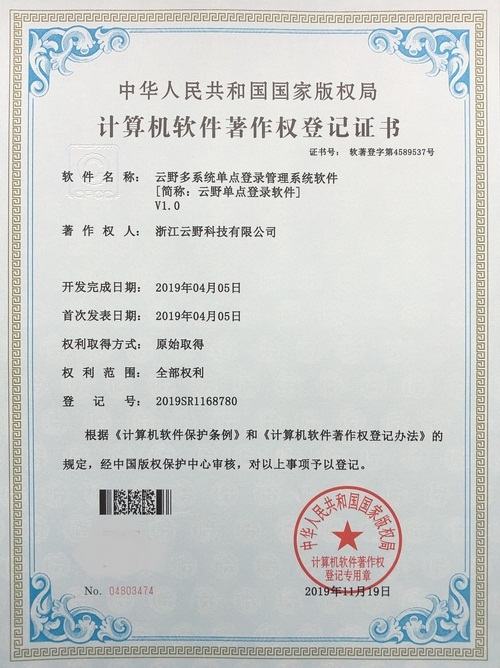 《云野多系統單點登錄管理系統軟件V1.0》于2019年11月19日被正式授予《中華人民共和國國家版權局計算機軟件著作權登記證書》,登記號為2019SR1168780。