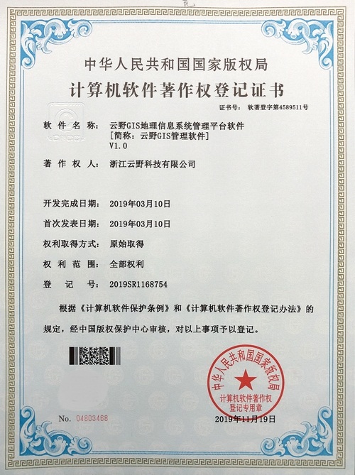 《云野GIS地理信息系統管理平臺軟件V1.0》于2019年11月19日被正式授予《中華人民共和國國家版權局計算機軟件著作權登記證書》,登記號為2019SR1168754。