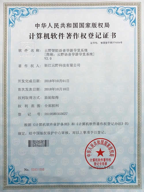 《云野智能語音導游導覽系統V2.0》于2019年4月19日被正式授予《中華人民共和國國家版權局計算機軟件著作權登記證書》,登記號為2019SR0353627。