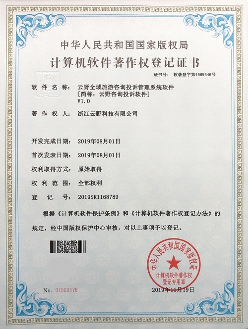 《云野全域旅游咨詢投訴管理系統軟件V1.0》于2019年11月19日被正式授予《中華人民共和國國家版權局計算機軟件著作權登記證書》,登記號為2019SR1168789。