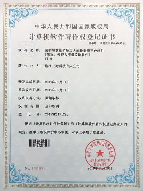《云野智慧旅游游客人流量監測平臺軟件V1.0》于2019年11月19日被正式授予《中華人民共和國國家版權局計算機軟件著作權登記證書》,登記號為2019SR1171298。