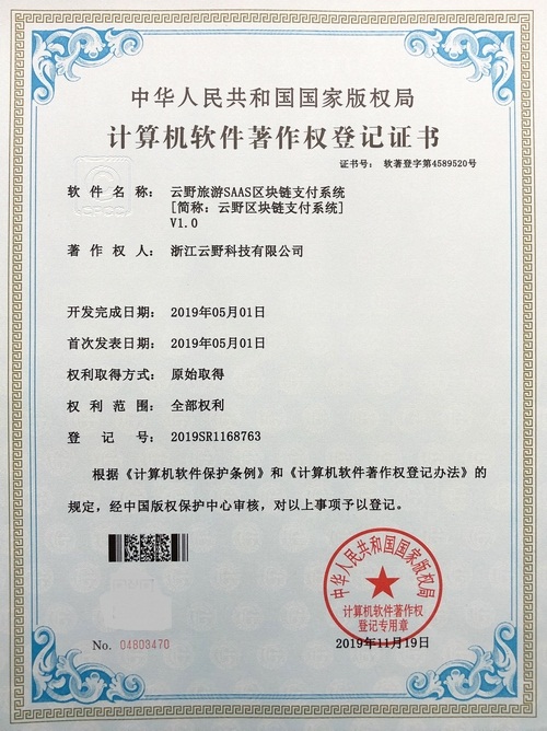 《云野旅游SAAS區塊鏈支付系統V1.0》于2019年11月19日被正式授予《中華人民共和國國家版權局計算機軟件著作權登記證書》,登記號為2019SR1168763。